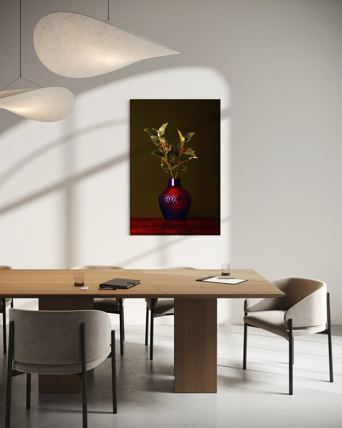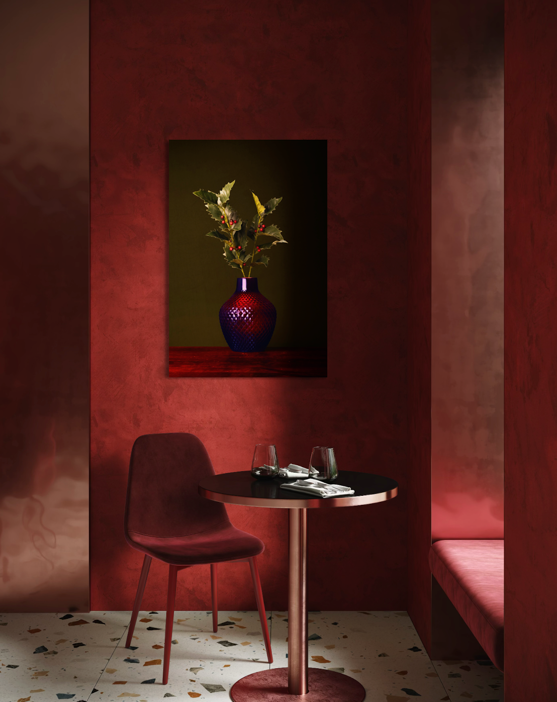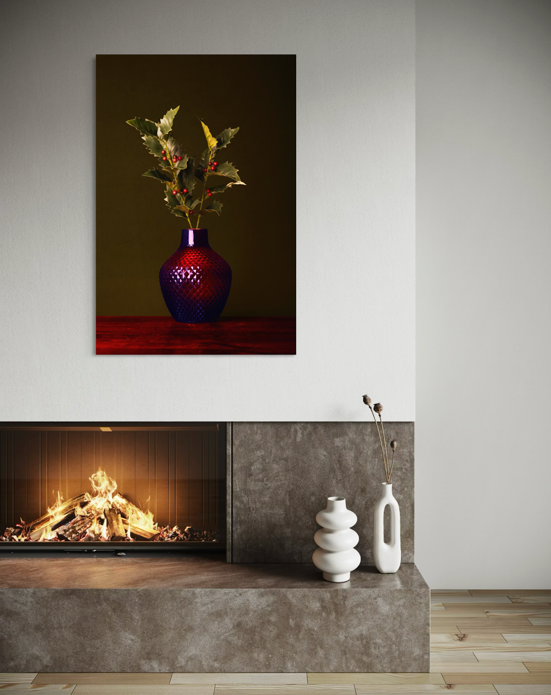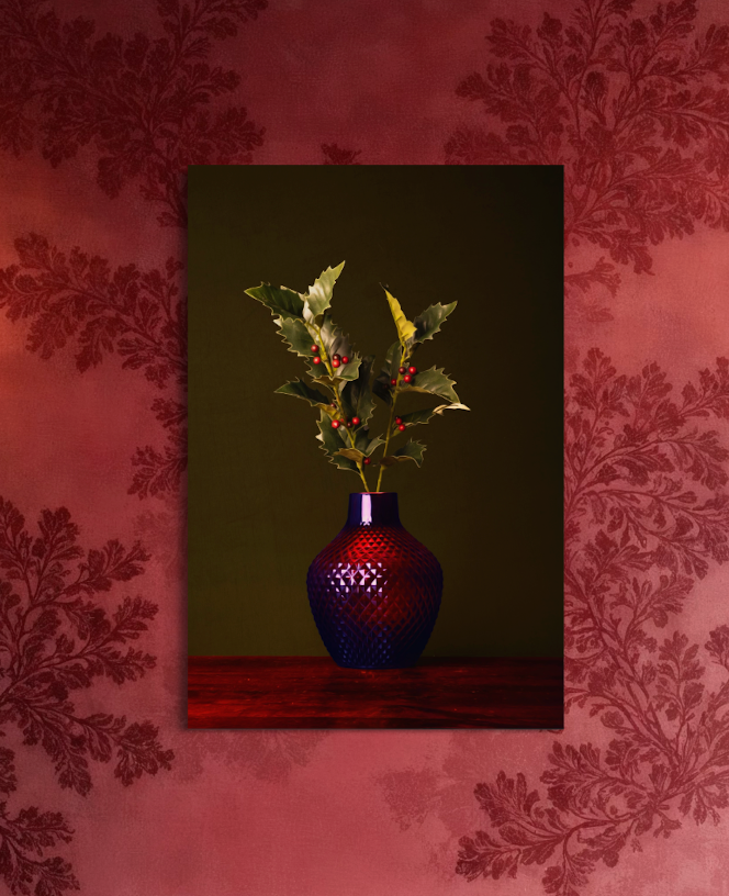 Stilleven van Ilex met rode en fel groene tinten in rode vaas tegen een mosgroene achtergrond. Belangrijkste kleuren in dit kunstwerk rood en groen.
