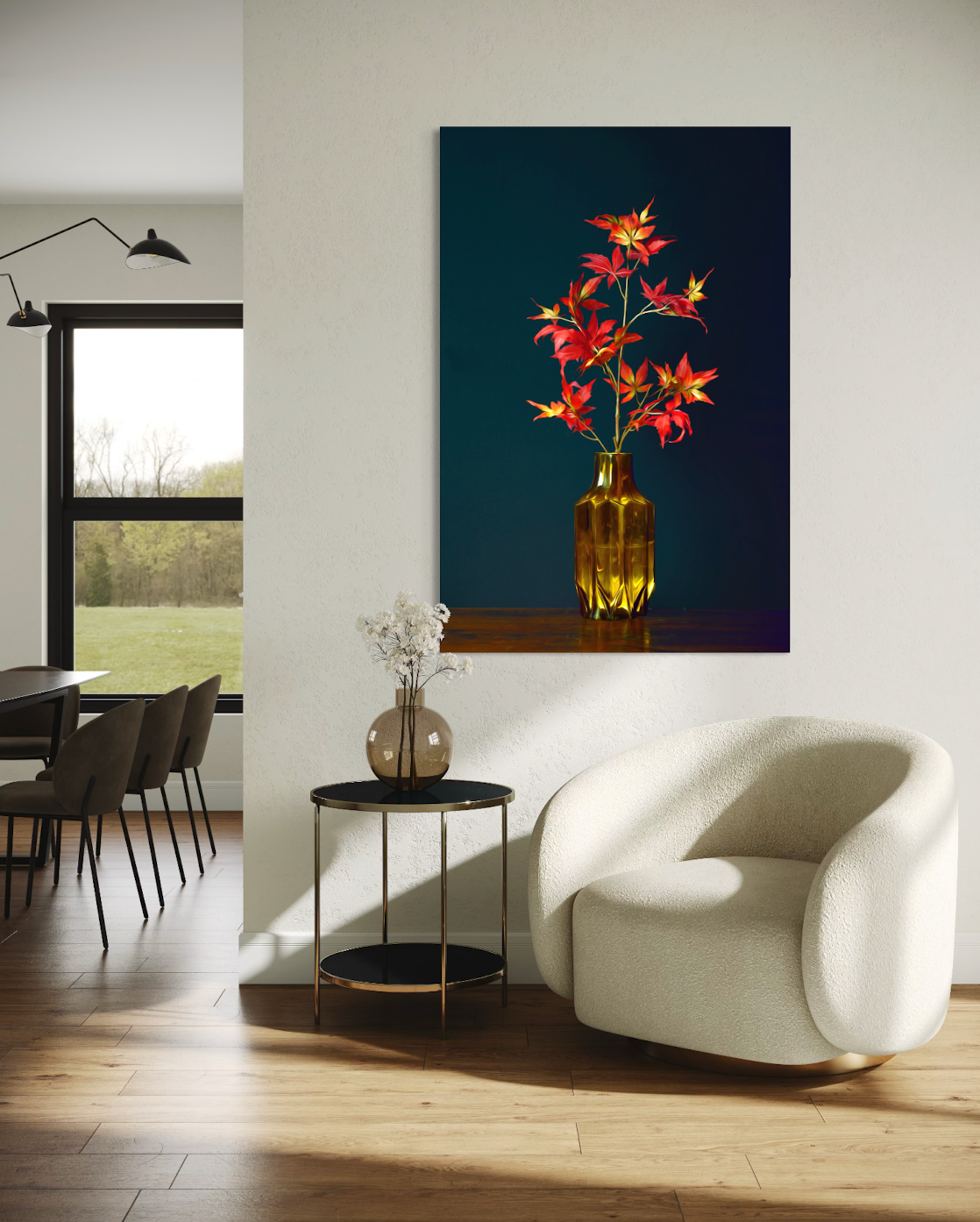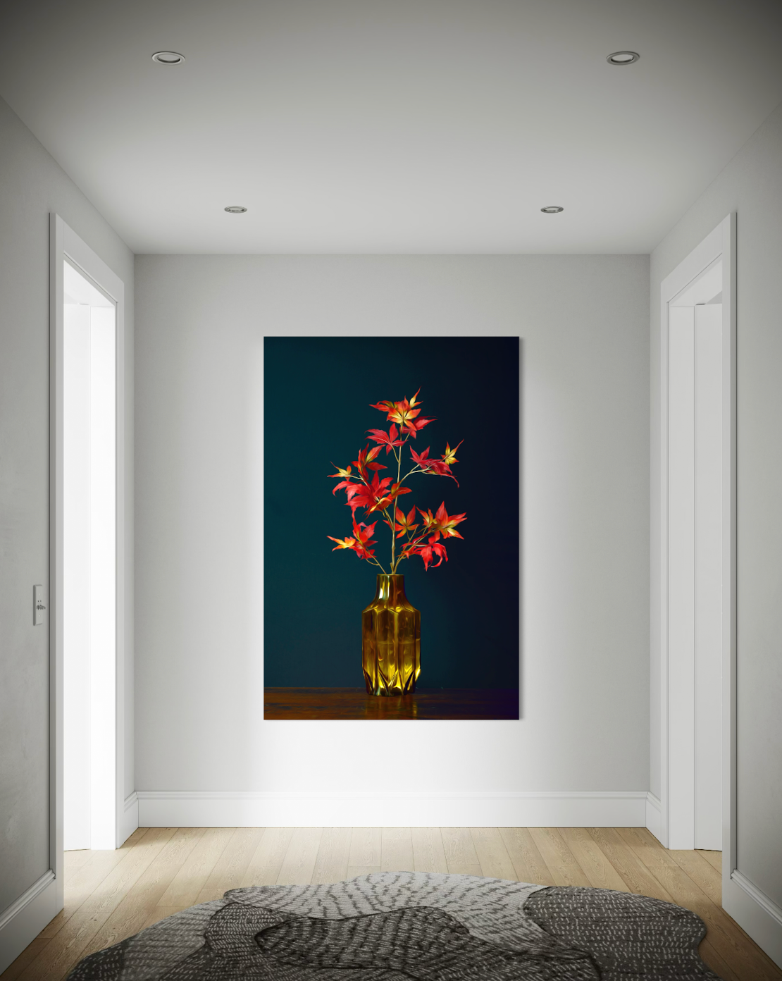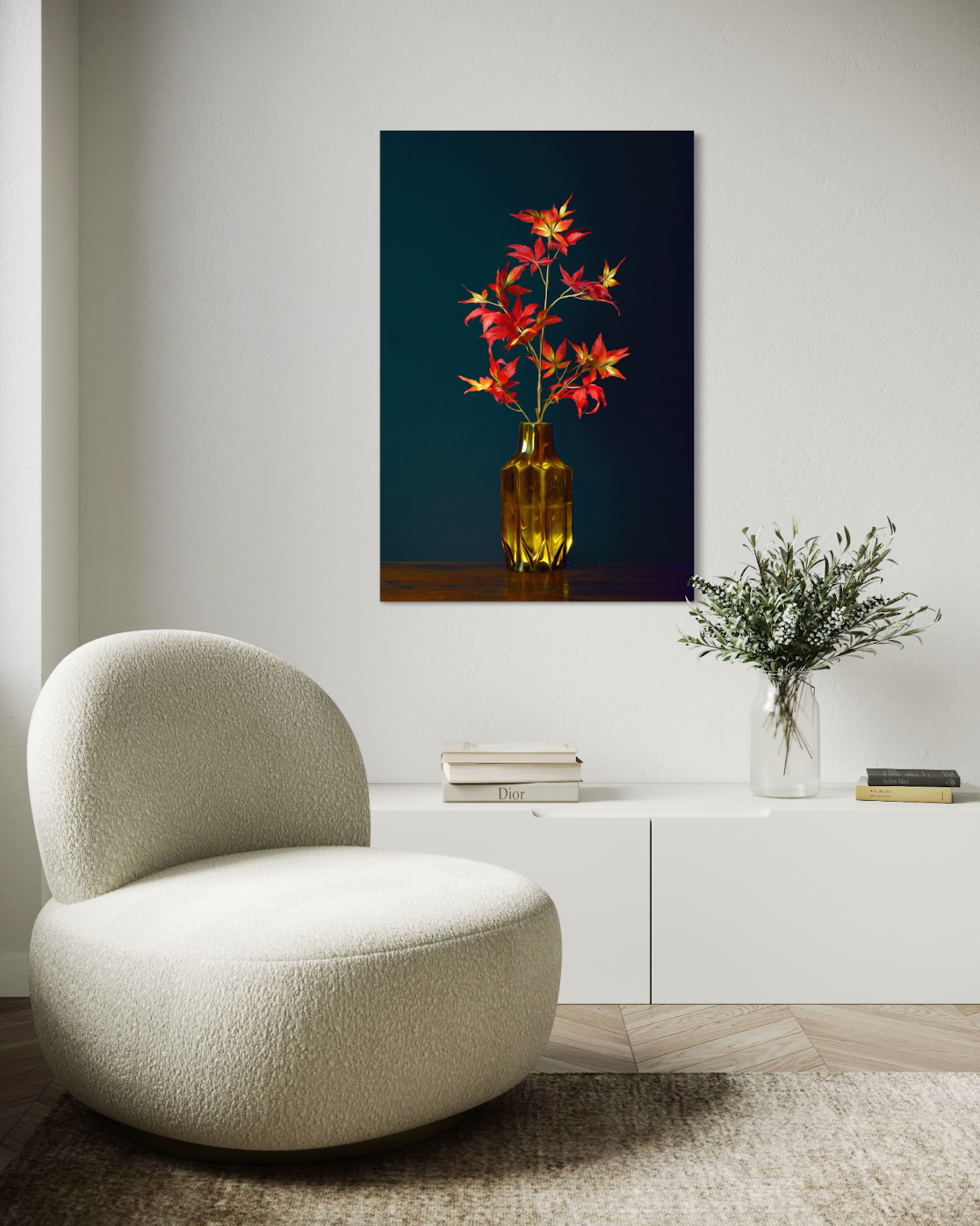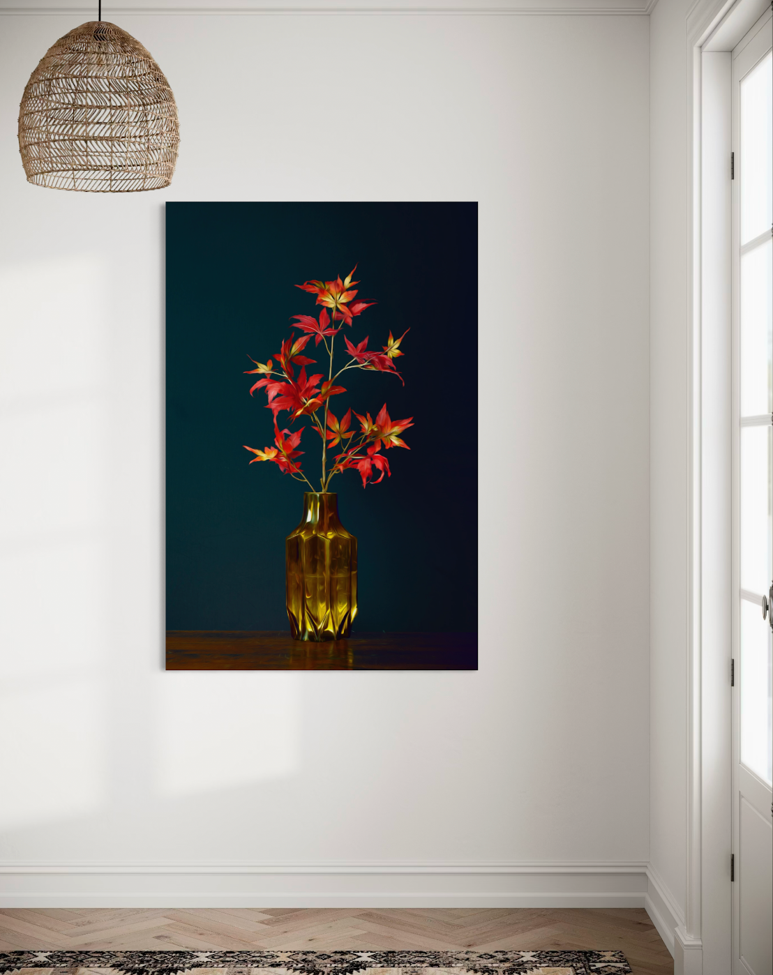 Stilleven van herfstbladeren met rode en fel groene tinten in groene vaas tegen een donkerblauwe achtergrond. Belangrijkste kleuren in dit kunstwerk rood, blauw en groen. Dit Stilleven is te koop in de formaten 20x30cm, 30x45cm, 40x60cm, 70x105cm, 80x120cm en 100x150cm.